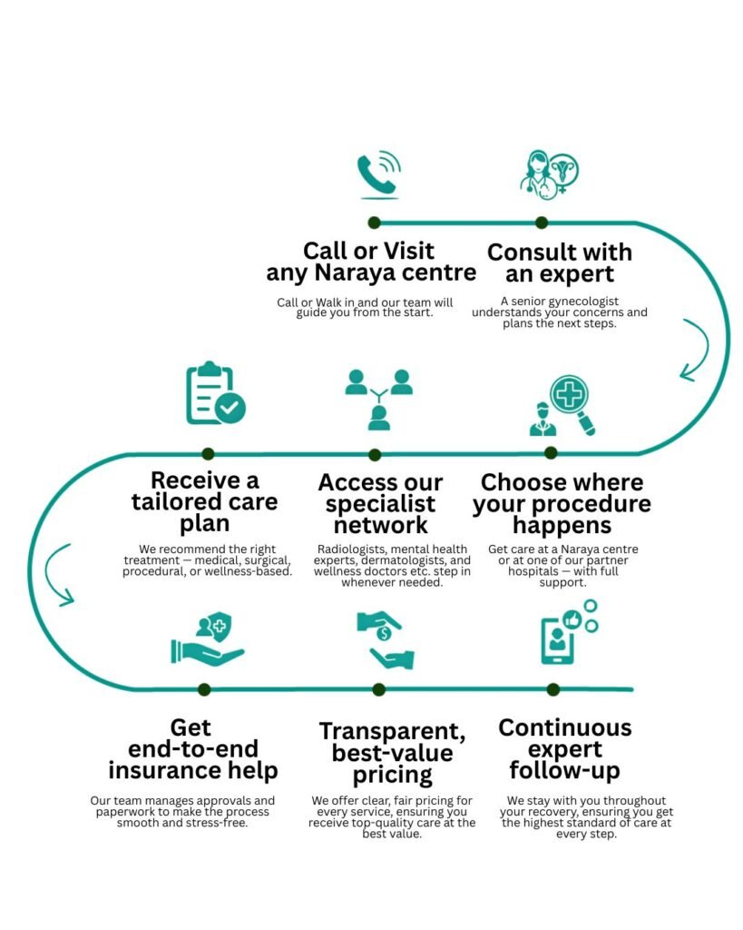 Naraya Health offers a wide range of women’s health services including pregnancy care, delivery support, gynaecology treatments, and infertility/IVF & test-tube baby services. These services are delivered by experienced specialists focused on personalized and compassionate care.